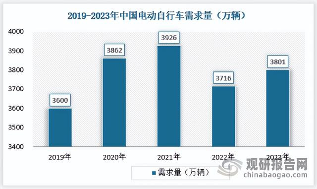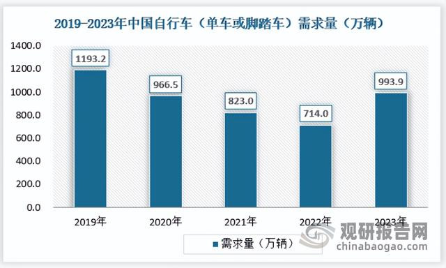 由于电动自行车行业的发展,同时对比单车具有快速的优点,2019-2023年我国单车需求量有所下滑,随着城市骑行热潮的掀起,以及人们健康锻炼需求的增加,2023年单车需求量有所上升。
