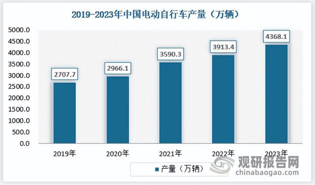 发展至今,中国已成为全球最大电动自行车生产和消费国,年产量和消费量占世界总产量和消费量的比重均超过9成,数据显示,随着国内电动自行车国内和出口增长,我国电动自行车产量逐年走高,2023年达到4368.1万辆。