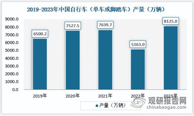 我国自行车产量已经处于世界领先水平,2022年受疫情封控程度加深影响,出口量下滑,产量下跌较为明显。2023年产量有所提高,达到8125万辆。