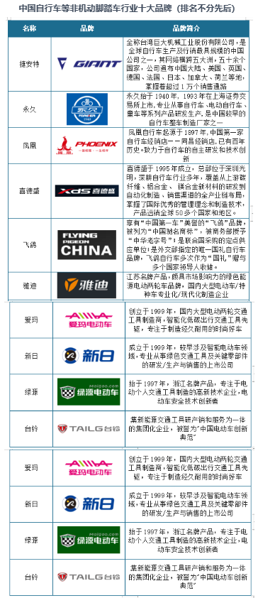 目前在行业里比较知名的非机动脚踏车品牌有捷安特、永久、凤凰、喜德盛、飞鸽、雅迪、爱玛、新日、绿源、台铃等。